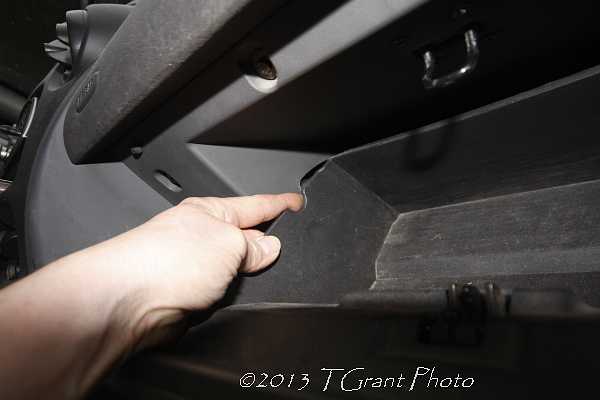 After the glove compartment door is loose, swing it all the way down. You’ll see the slim (approx. 2″ x 10″) cover to the air filter. If it hasn’t been tinkered with, you’ll see two plastic pull-clips on either end (in our case the clips were gone so we replaced them with small sheet metal scews).